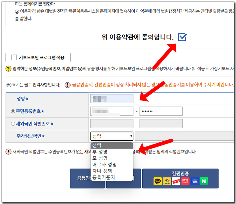 ํ์ด์ง๊ฐ ์ด๋ํ๋ฉด ์ด์ฉ์ฝ๊ด์ ๋์์ ์ฒดํฌ๋ฅผ ํฉ๋๋ค. ๊ทธ๋ฆฌ๊ณ ์ฑ๋ช , ์ฃผ๋ฏผ๋ฑ๋ก๋ฒํธ๋ฅผ ์ ๋ ฅํ๊ณ ์ถ๊ฐ์ ๋ณดํ์ธ์์ ๋ถ,๋ชจ, ๋ฐฐ์ฐ์, ์๋ ์ค ํ๋๋ฅผ ์ ํํ๊ณ ์ด๋ฆ์ ์ ๋ ฅํด ์ฃผ์๋ฉด ๋ฉ๋๋ค.
