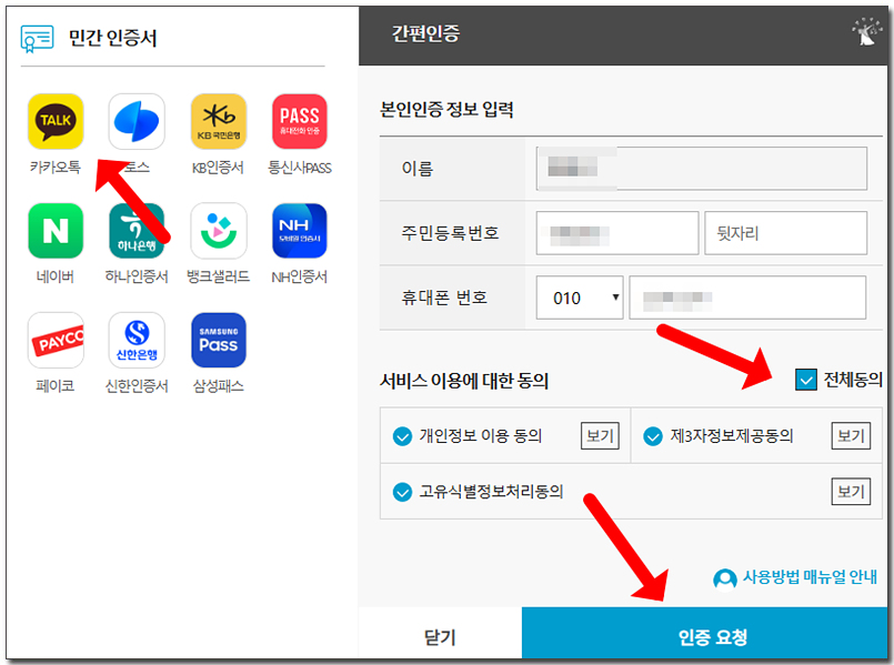 ๊ฐํธ ์ธ์ฆ ์ฐฝ์ด ์ด๋ฆฌ๋ฉด ๋ณธ์ธ์ธ์ฆ ์ ๋ณด๋ฅผ ์ ๋ ฅํ๊ณ ์ ์ฒด๋์์ ์ฒดํฌ๋ฅผ ํฉ๋๋ค. ๊ทธ๋ฆฌ๊ณ ๋ฏผ๊ฐ ์ธ์ฆ์๋ฅผ ์ ํํ๊ณ ์ธ์ฆ ์์ฒญ์ ํด์ฃผ์๋ฉด ๋ฉ๋๋ค. ๊ฐ์ธ์ ์ผ๋ก ์นด์นด์คํก์ ์ฌ์ฉํฉ๋๋ค.
